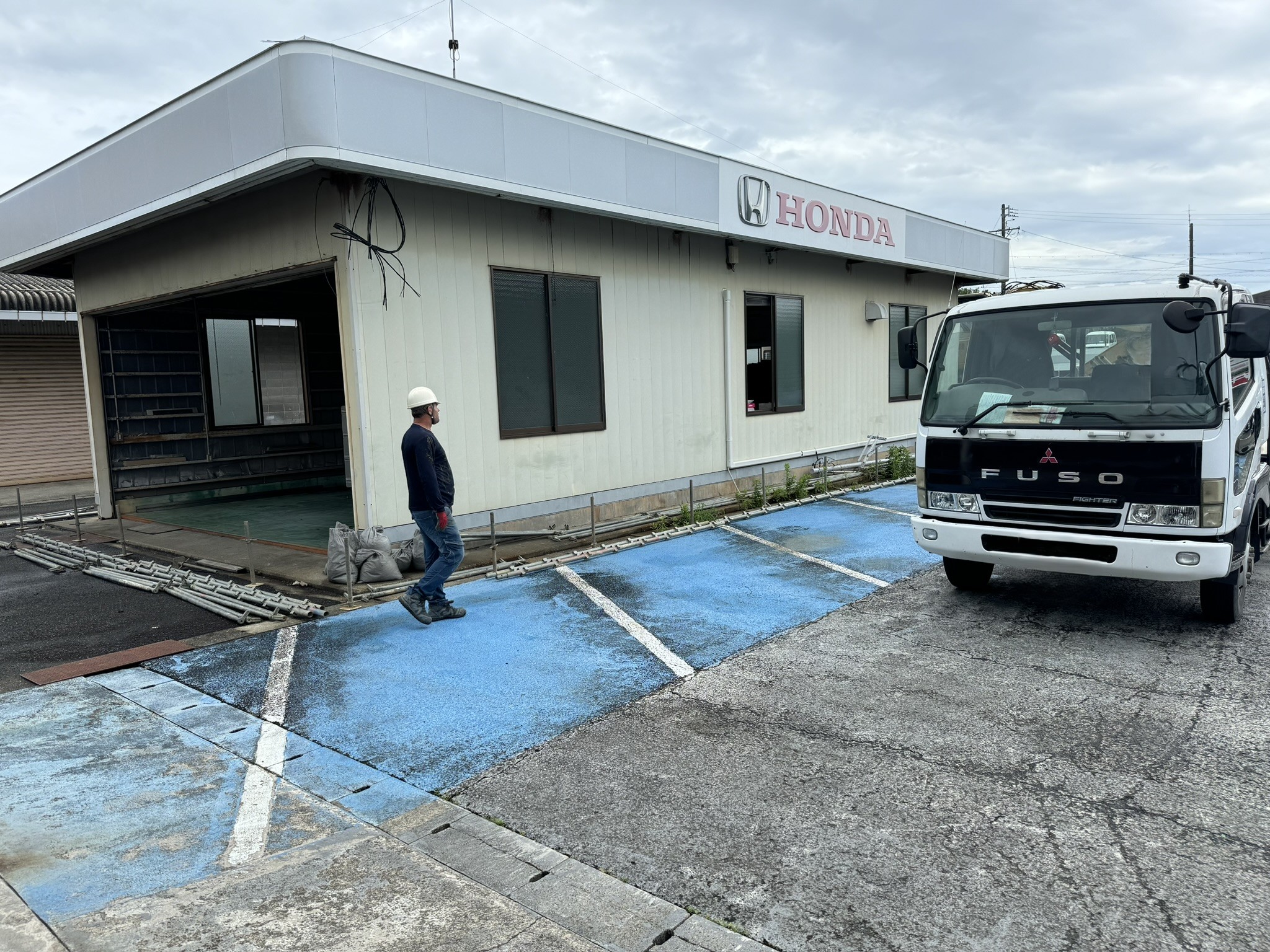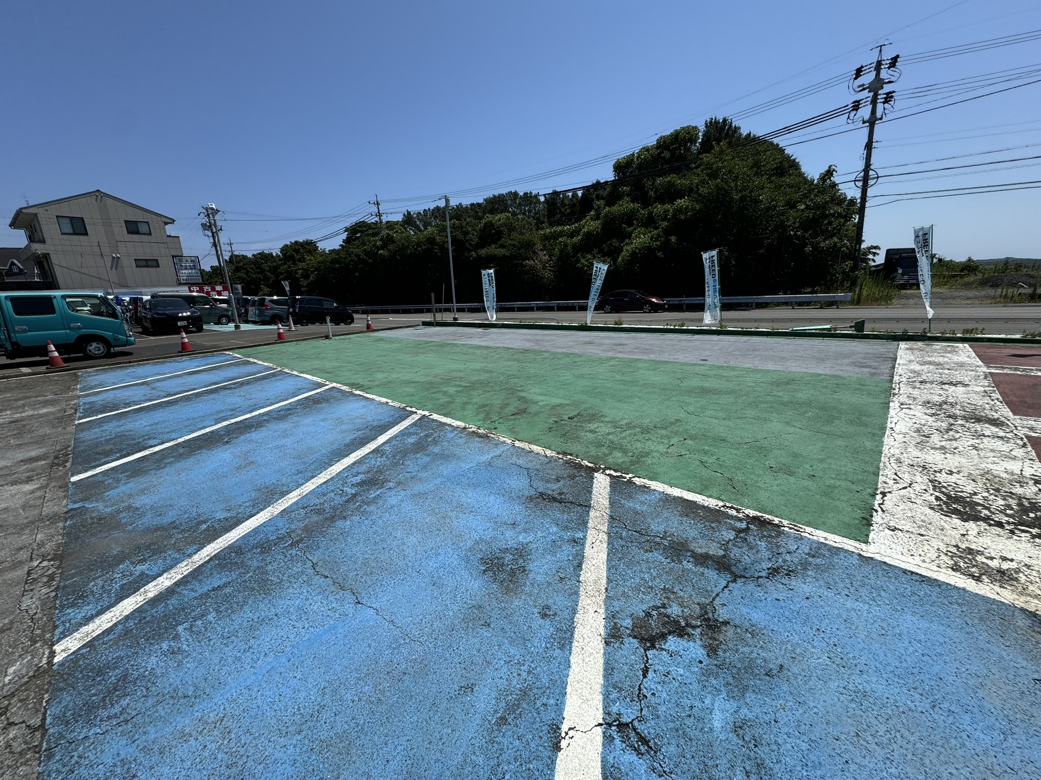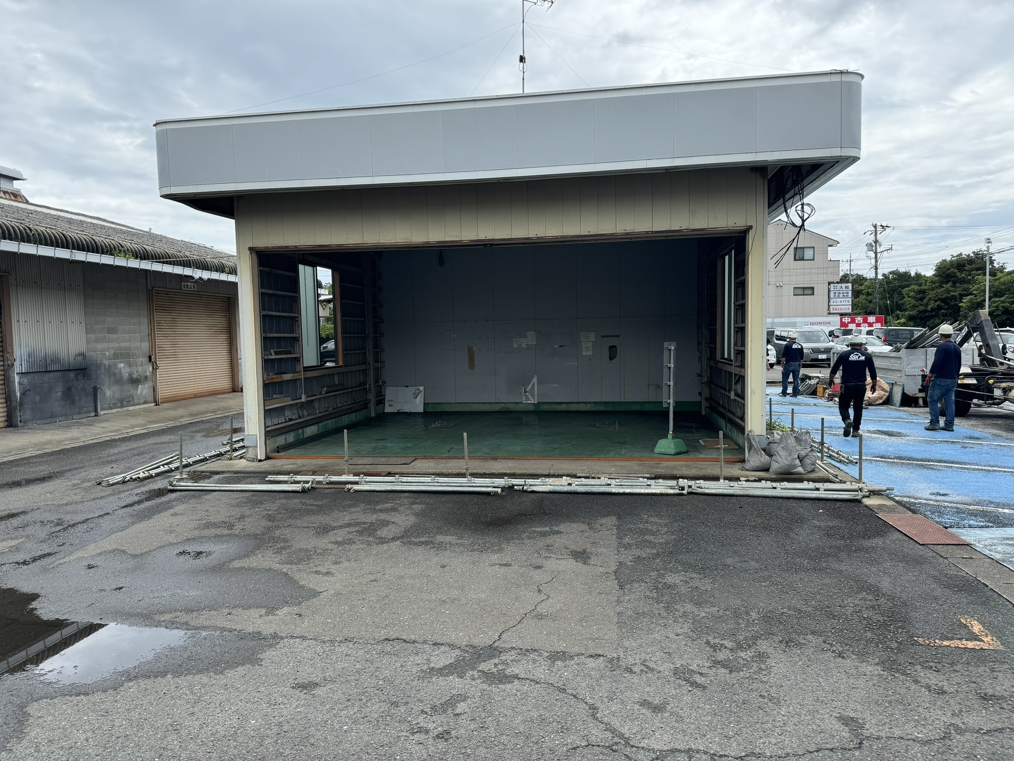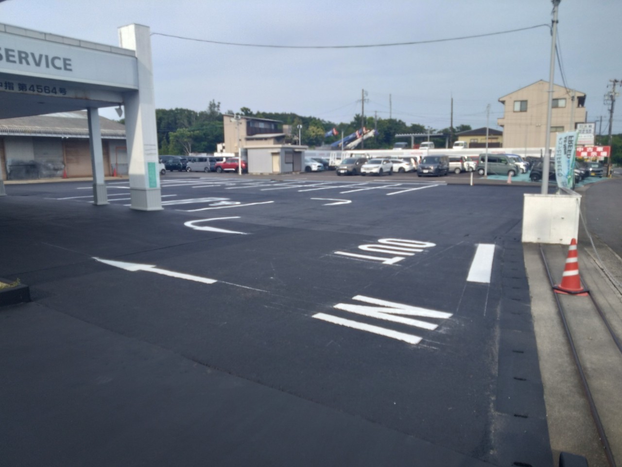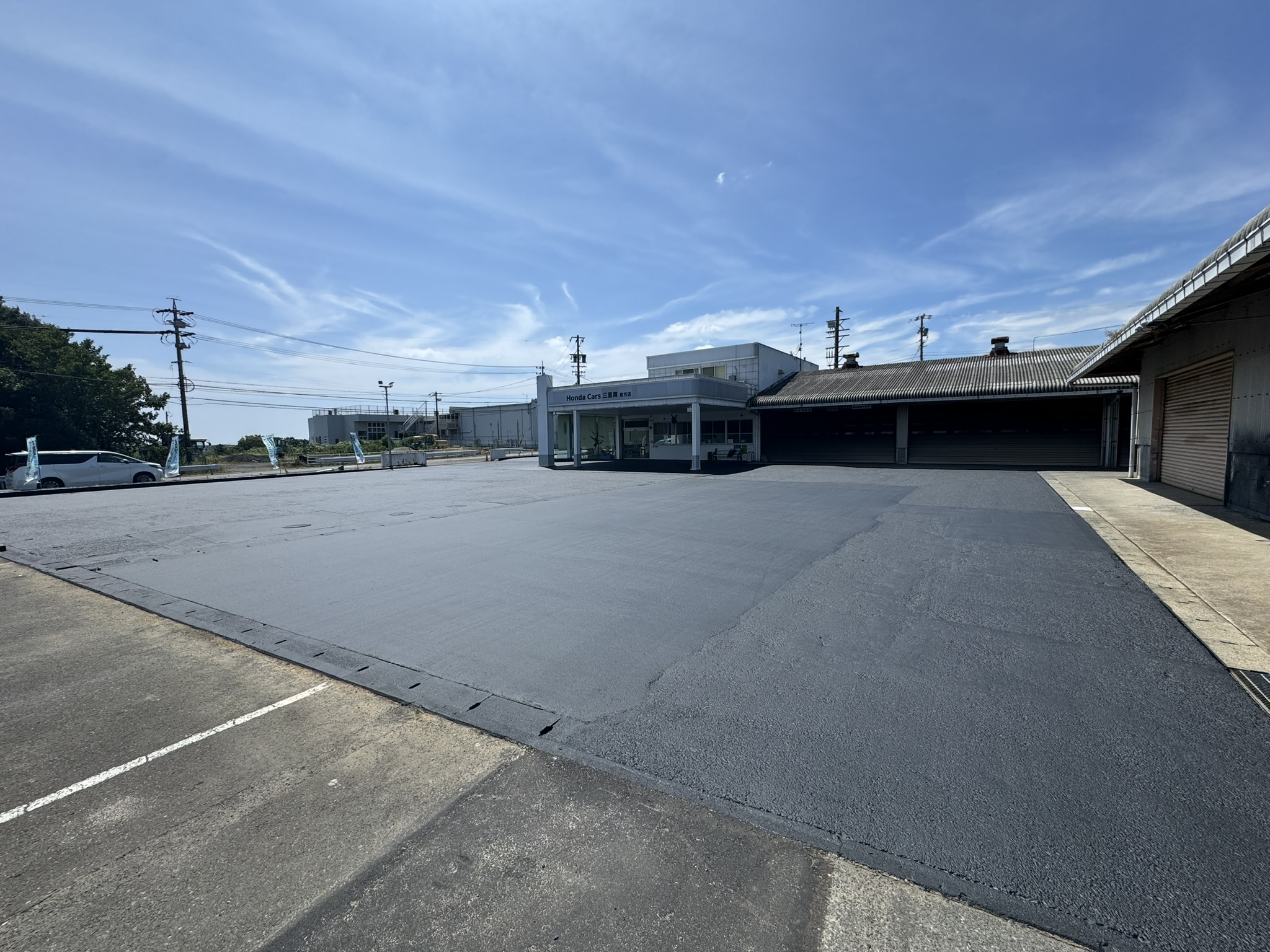 志摩市 建屋解体・アスファルト新設・床塗装工事 2025.03.28 老朽化した建屋の取り壊しを行い、取り壊し跡地にアスファルト打設、駐車場の全面的なレイアウト変更を施工させていただきました。before during・after