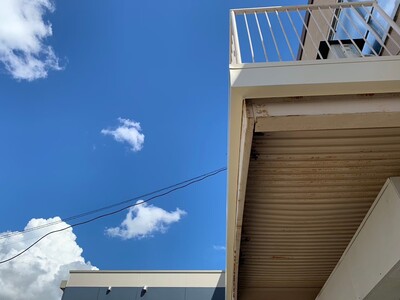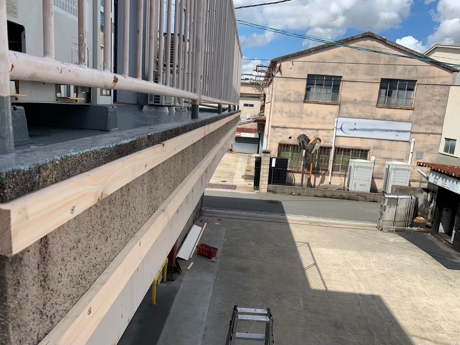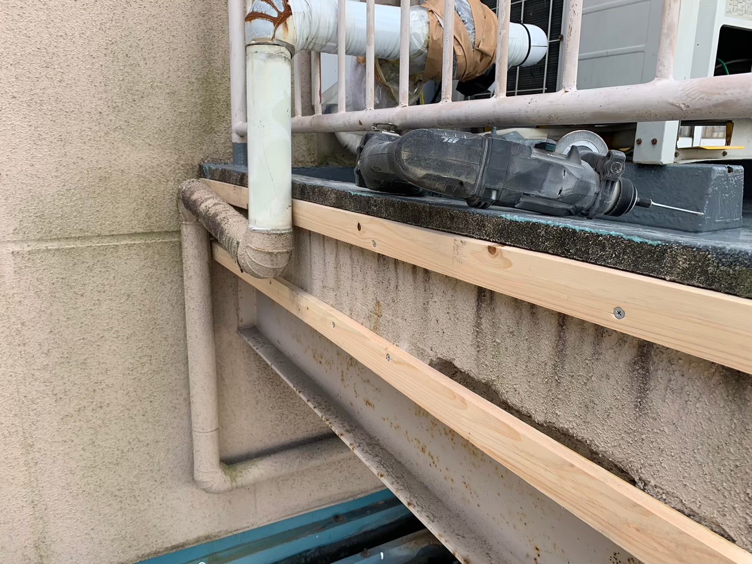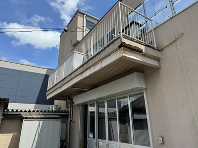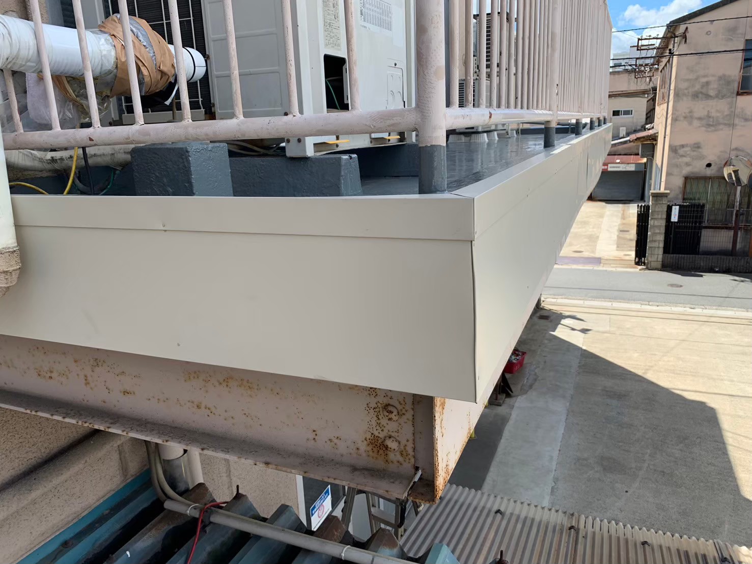 あま市 庇板金工事 2025.03.28 庇の老朽化により、部分的な崩落が起きるため板金にて、外部面を保護し、老朽化の原因でもあるバルコニーの防水、手摺根本の樹脂注入も施工させていただきました。before during after
