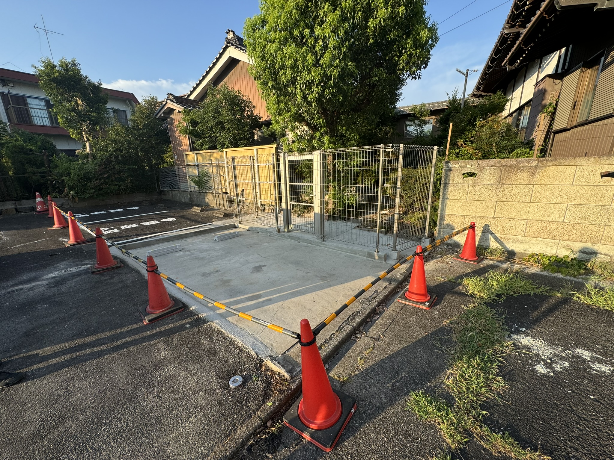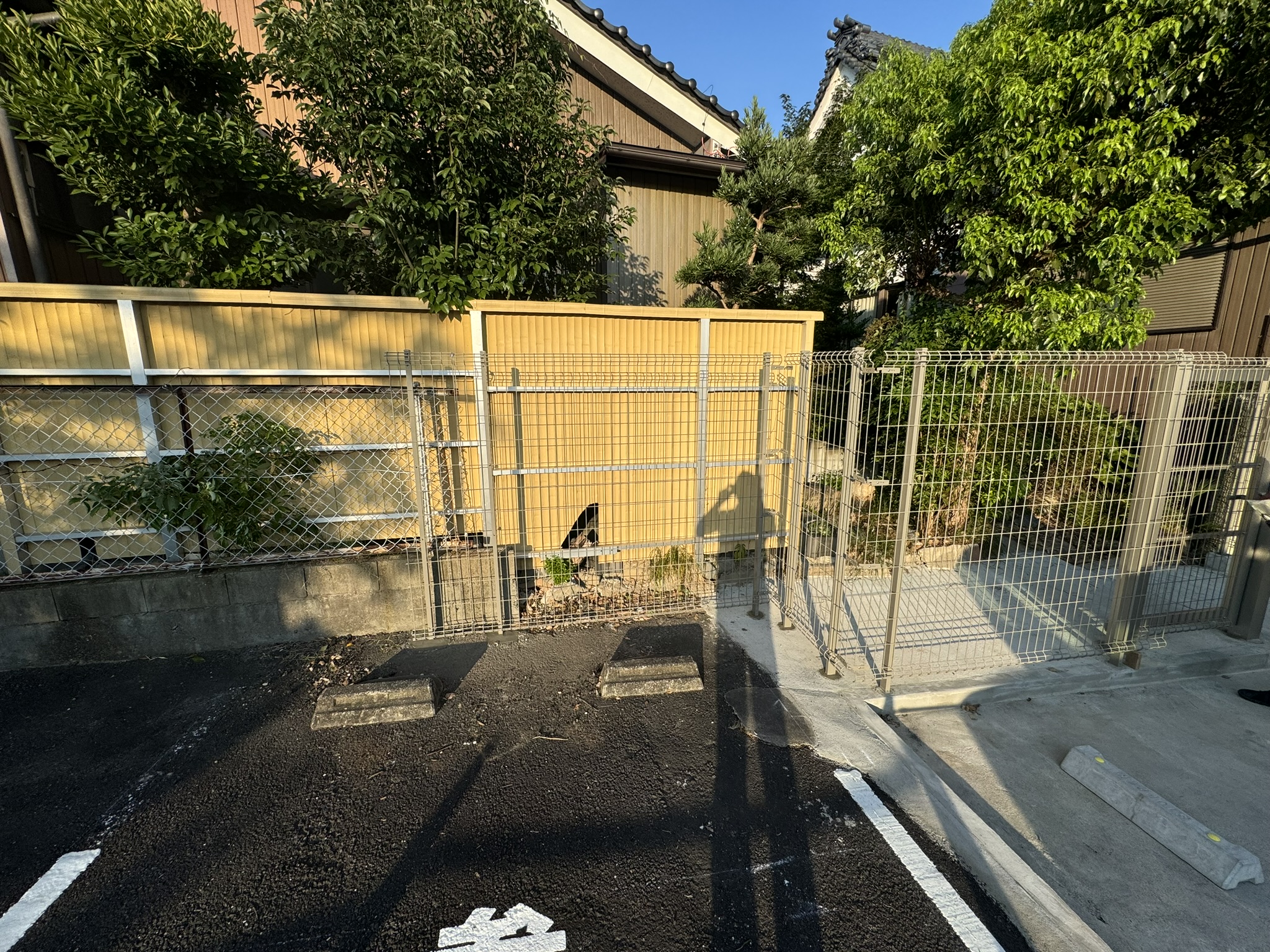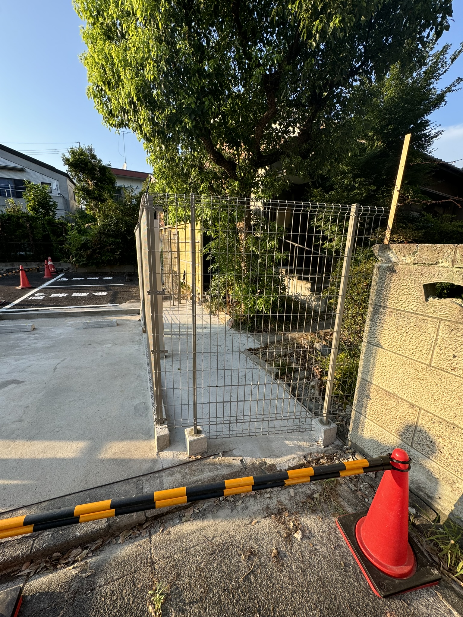 中村区 ガレージ解体・フェンス新設 2025.03.28 YKKAP:イーネットフェンスA1F型木造ガレージの解体後、防犯のため、メッシュフェンスの新設をさせていただきました。また、敷地入口部分が泥濘になりやすいため勾配を設けてコンクリートの打設も施工させていただきました。before after