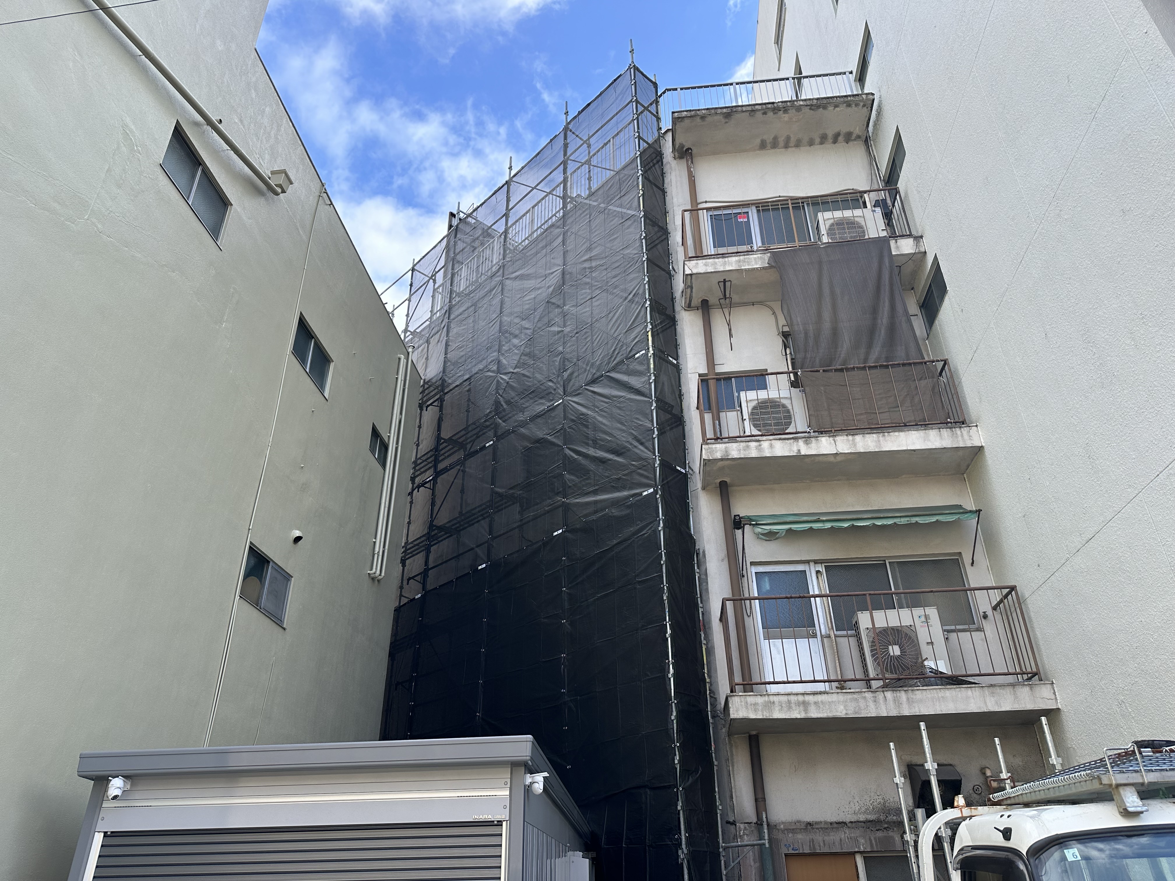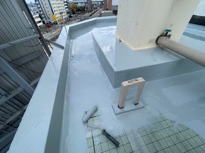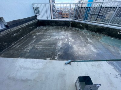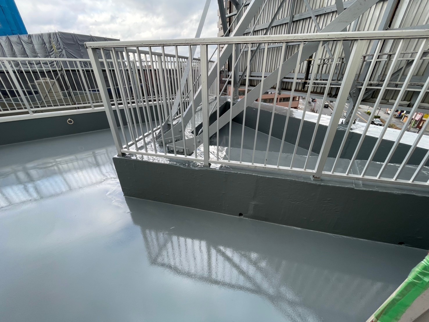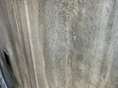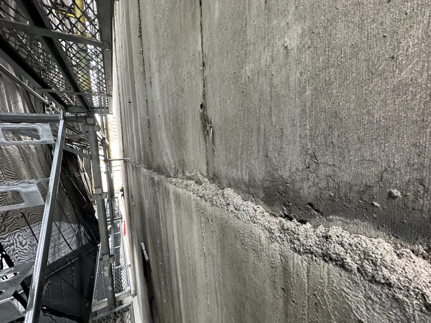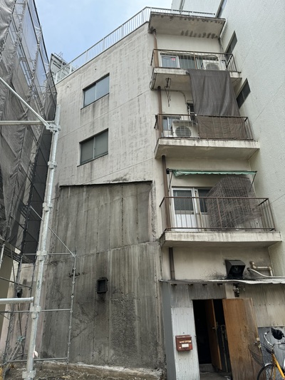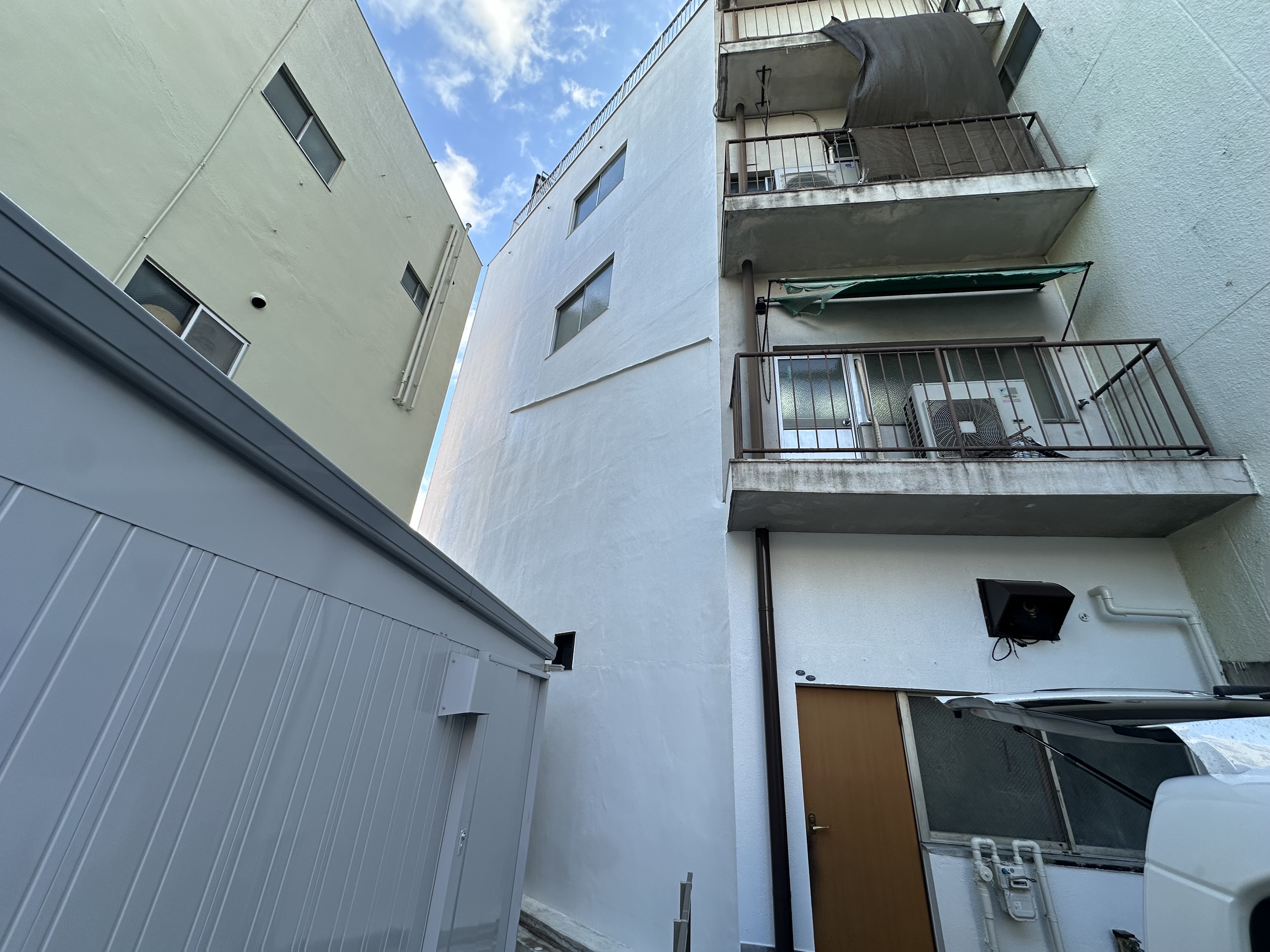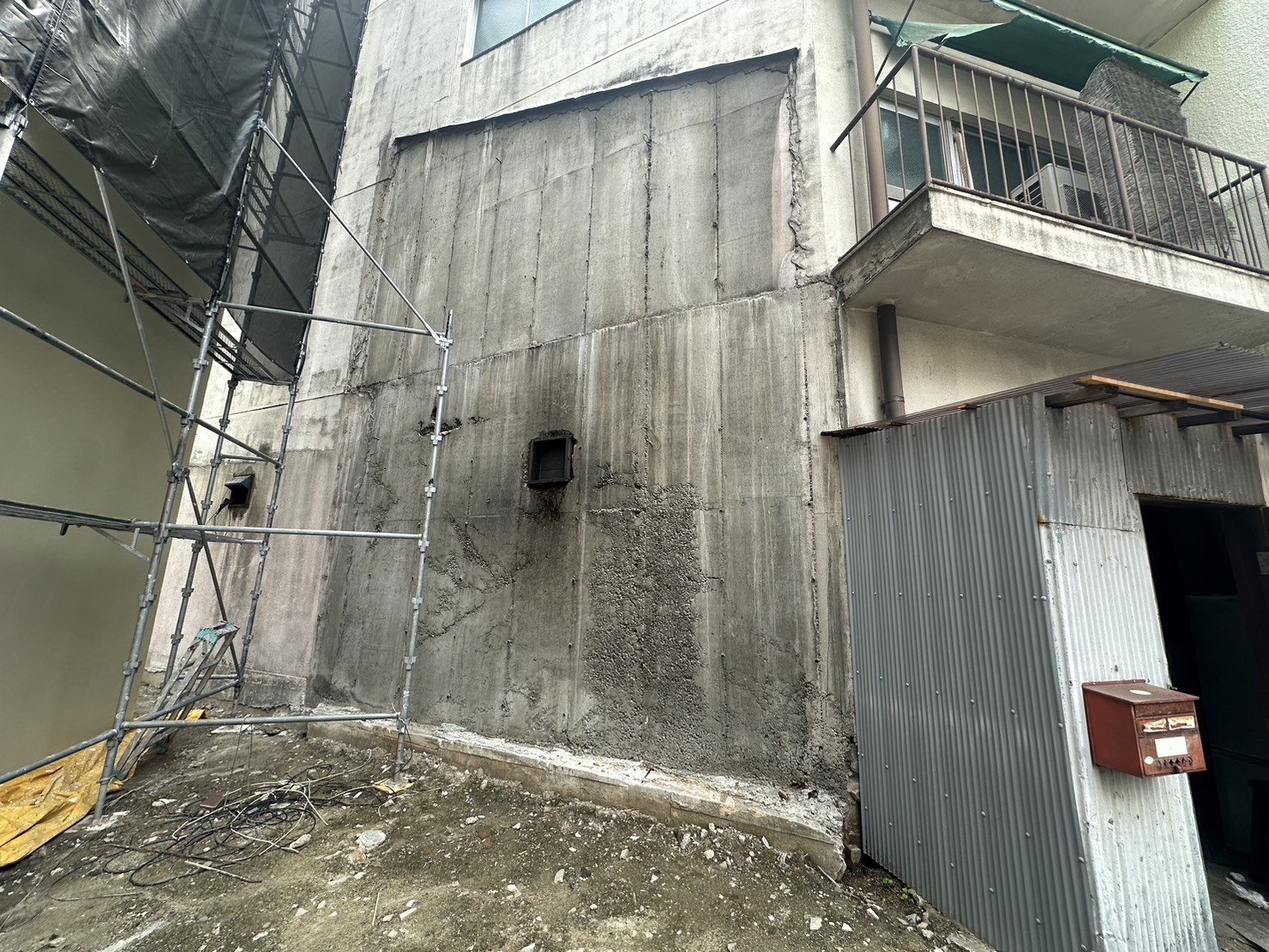 西区 ビル解体部補修工事・屋上防水工事 2025.04.03 外壁塗材:ハイパービルロックセラビルと隣接した家屋の解体に伴い、新築時状態の外壁の修繕を施工させていただきました。新築時のコンクリートが剝き出しの為、左官工事にて2~3回程度下地調整を行い、その後柄付け塗装を施工させていただきました。屋上については、最上階に雨漏れが発生しており、複雑な形状をしていたため、おおよそはウレタン塗膜防水密着工法にて施工させていただきました。明らかな塔屋漏水部については、通気緩衝工法にて施工させていただきました。before during after
