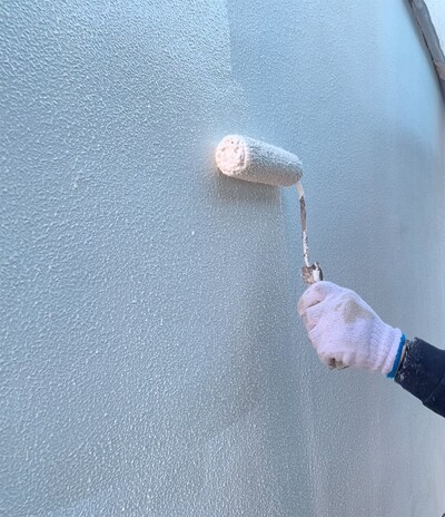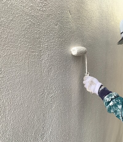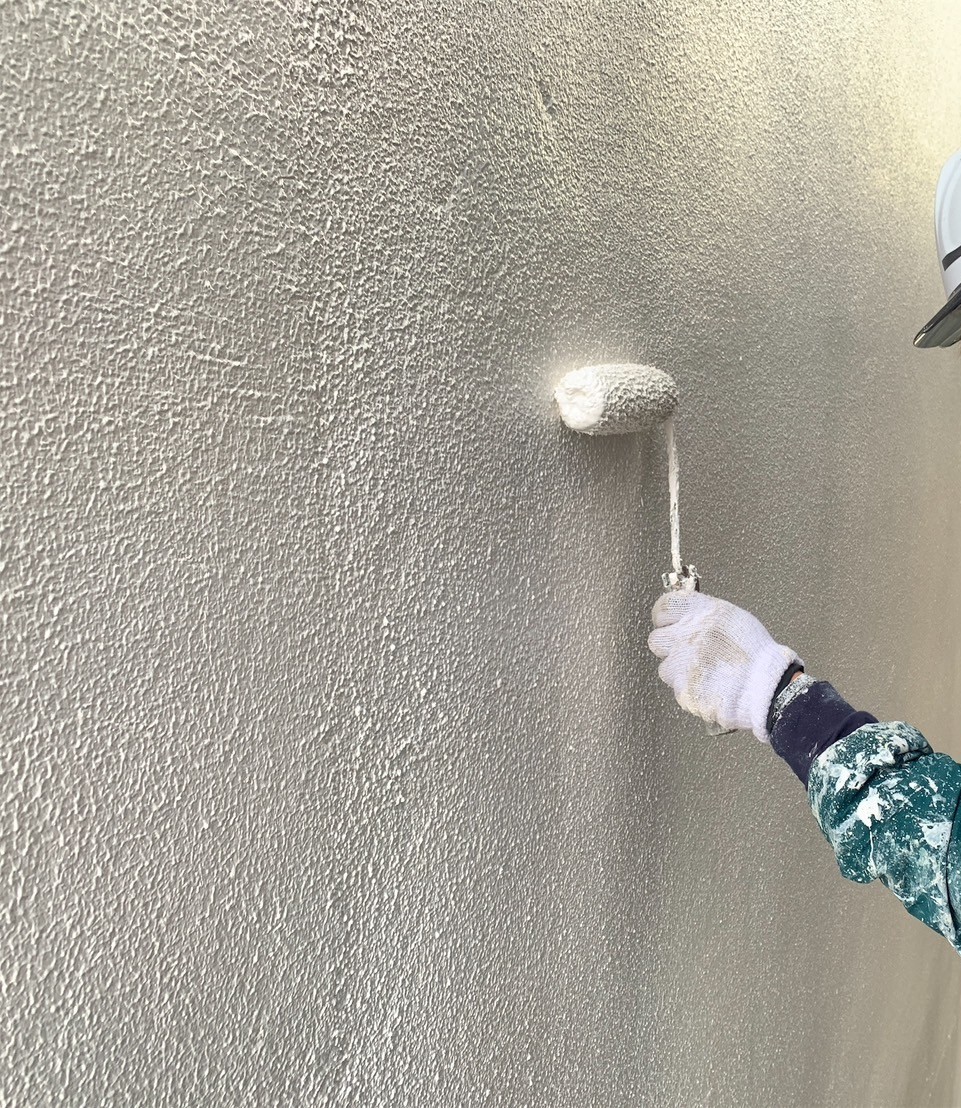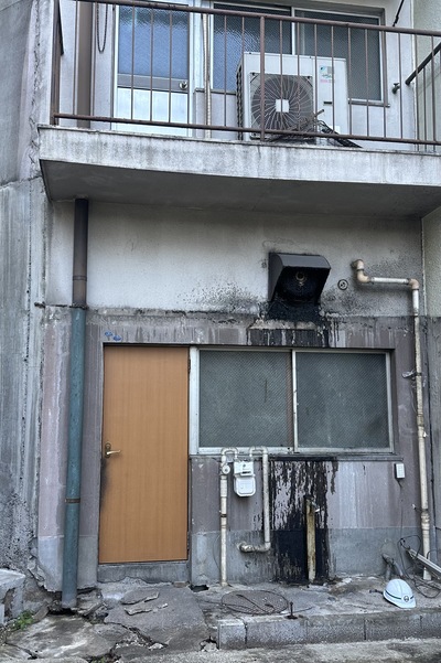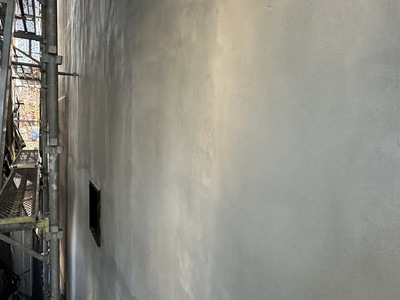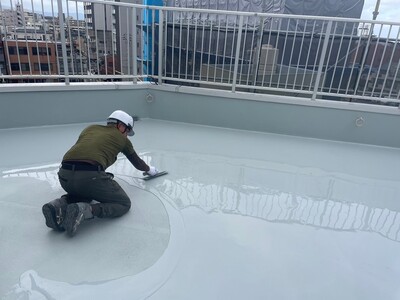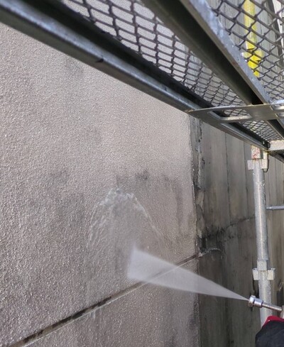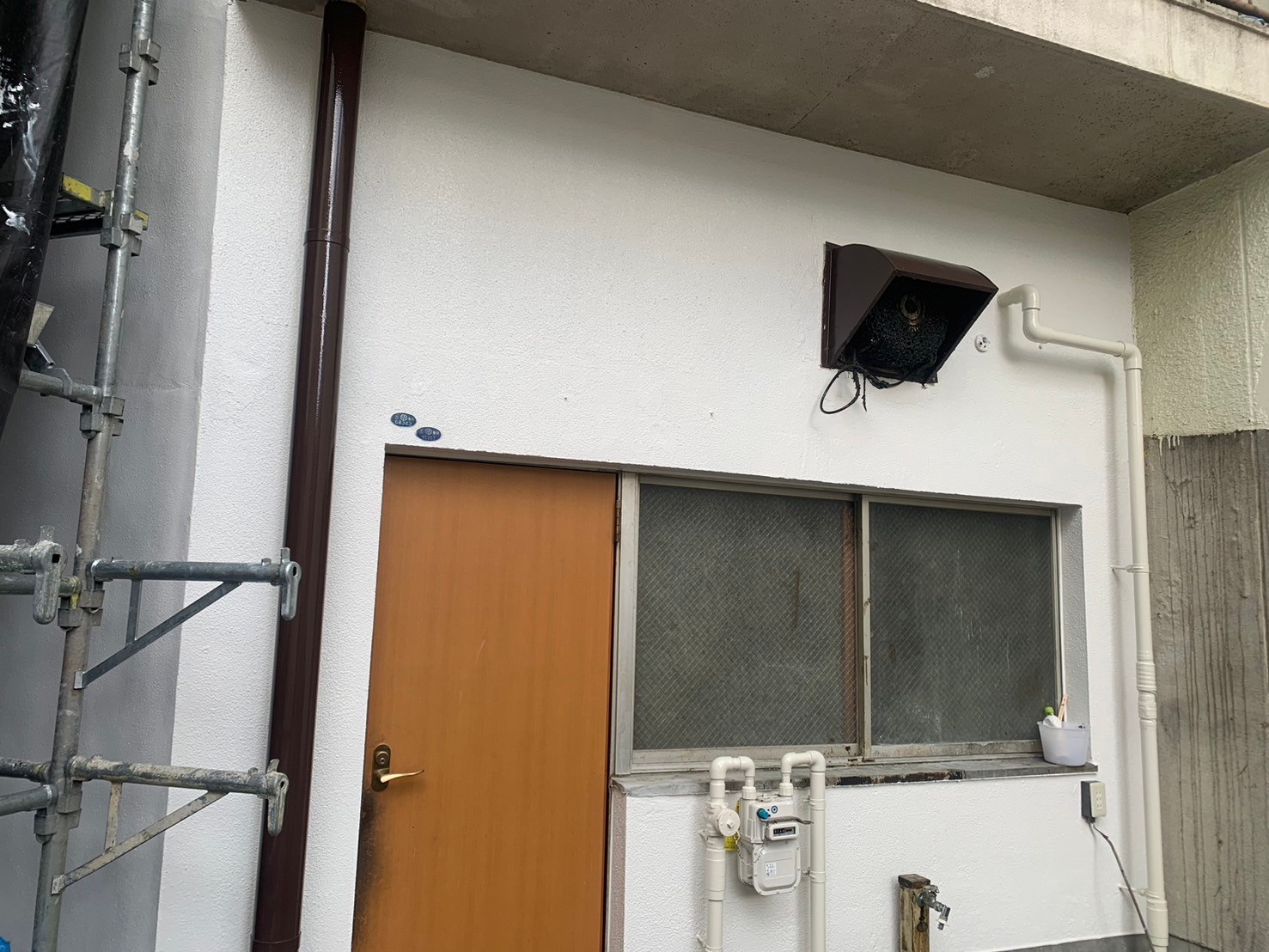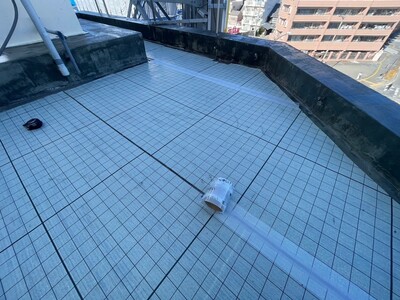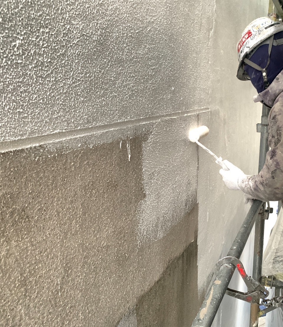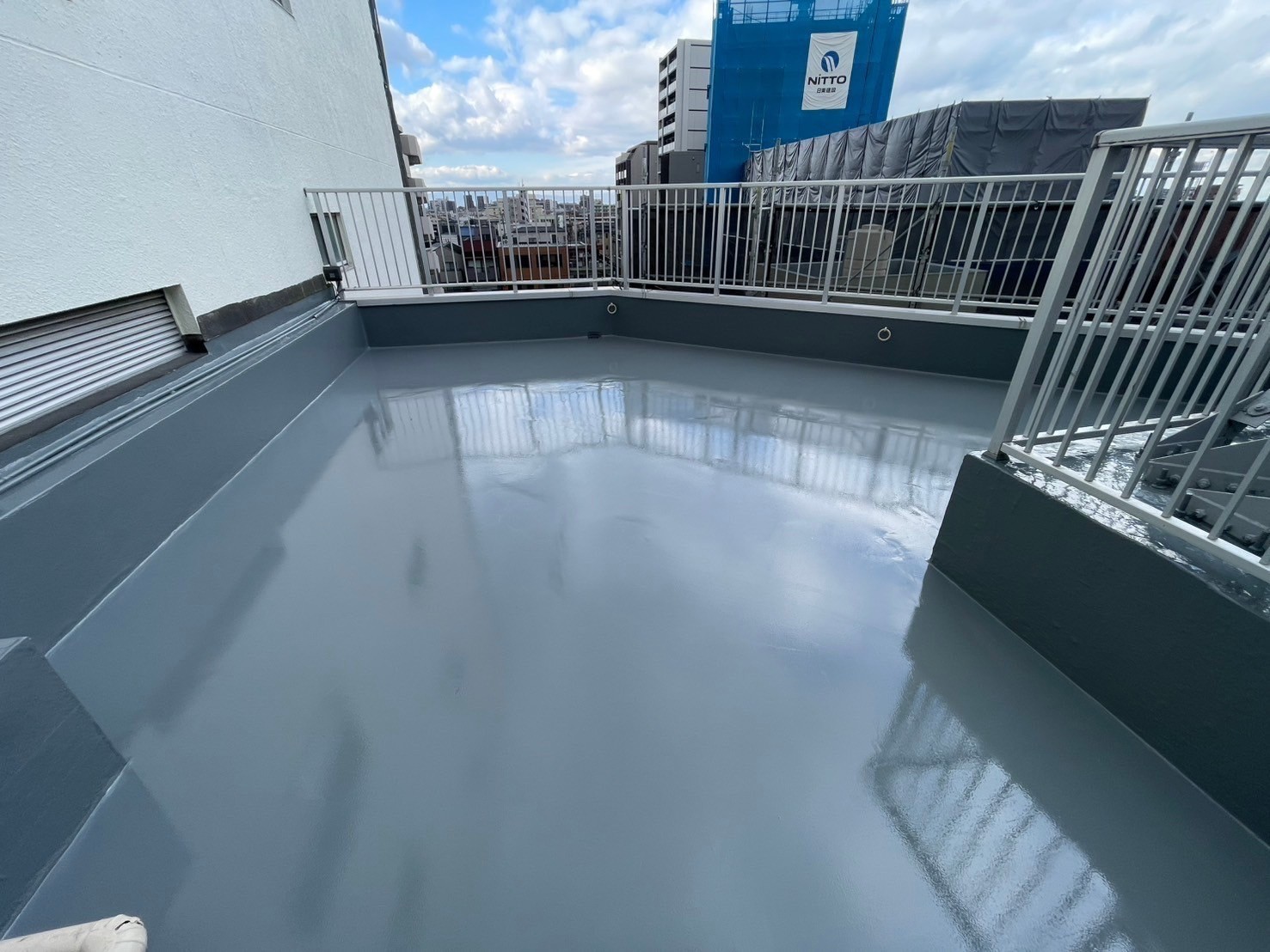 西区 ビル解体部補修工事・屋上防水工事 2025.04.03 外壁塗材:ハイパービルロックセラビルと隣接した家屋の解体に伴い、新築時状態の外壁の修繕を施工させていただきました。新築時のコンクリートが剝き出しの為、左官工事にて2~3回程度下地調整を行い、その後柄付け塗装を施工させていただきました。屋上については、最上階に雨漏れが発生しており、複雑な形状をしていたため、おおよそはウレタン塗膜防水密着工法にて施工させていただきました。明らかな塔屋漏水部については、通気緩衝工法にて施工させていただきました。before during after