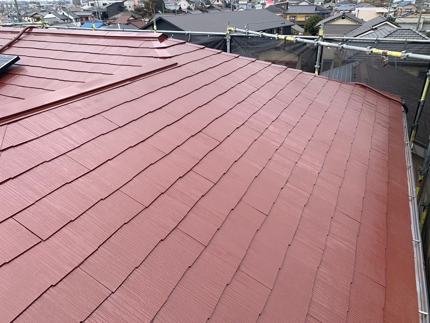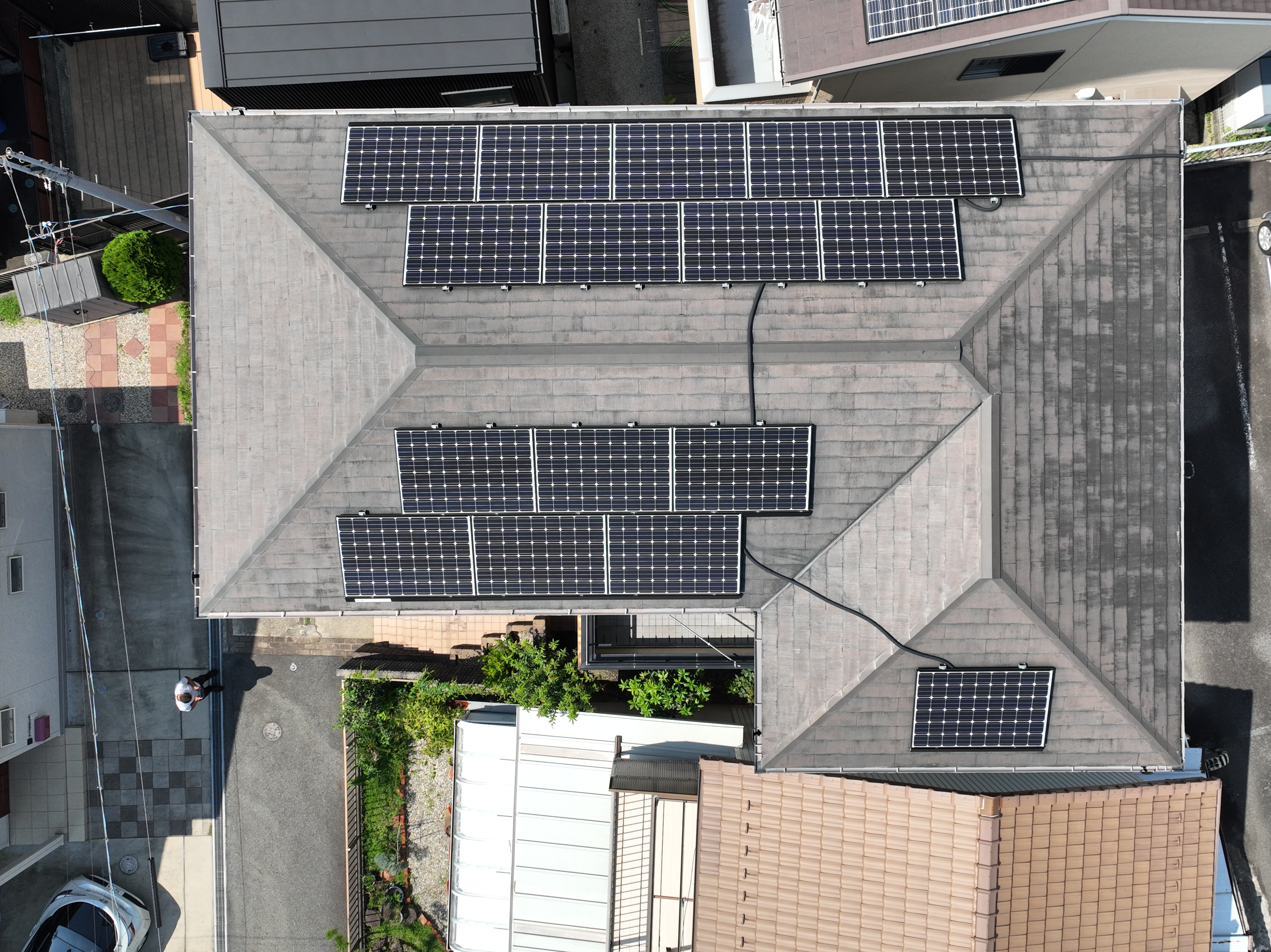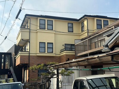 瀬戸市 屋根・外壁塗装 2025.04.15 前回塗替えから、15年以上が経過しご自宅の塗替えをご依頼いただきました。施工前に、ドローン調査による屋根の確認をさせていただきほとんどの屋根塗膜が劣化しているのを見受け、屋根は、下塗りのシーラーを2回以上塗布させていただきました。外壁については、前回塗装時にシール工事を行っておらず、各所の取り合いの塗膜剥離が起こっており、浸水する恐れがあったため、シール工事も施工させていただきました。before after 現調時ドローン撮影(ドローン調査では、地上50m近く程度からの撮影と、一眼レフ相当の画質で対応できるため、かなりはっきりと状態を確認することが可能です)