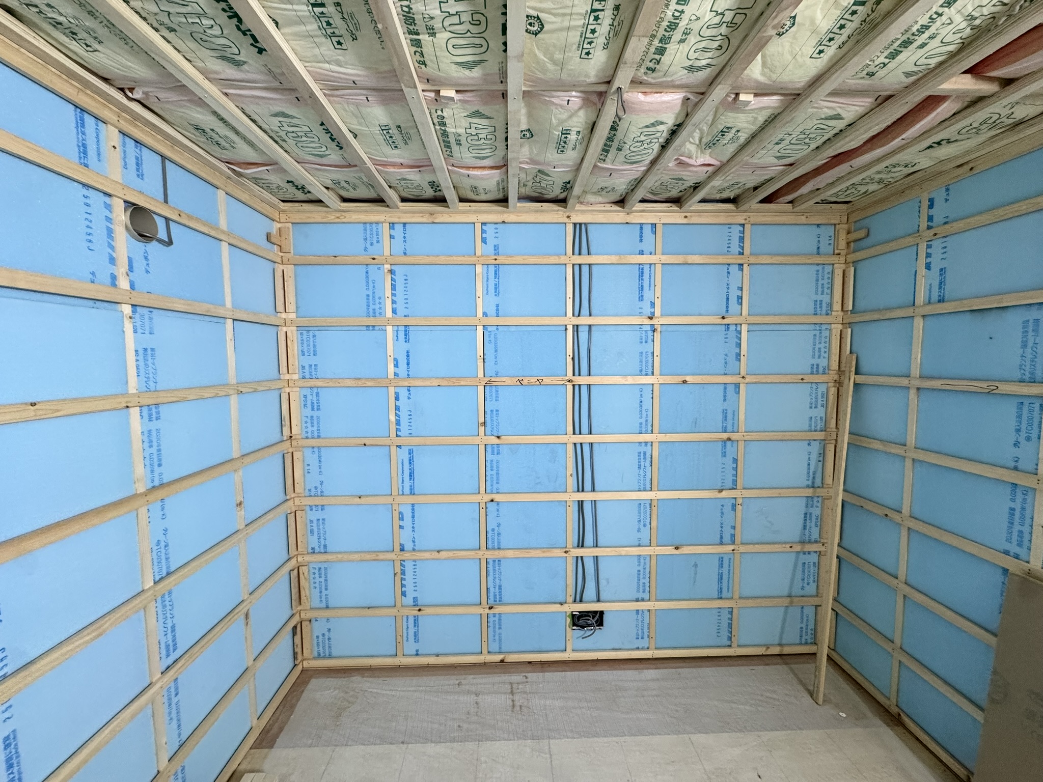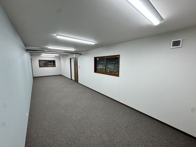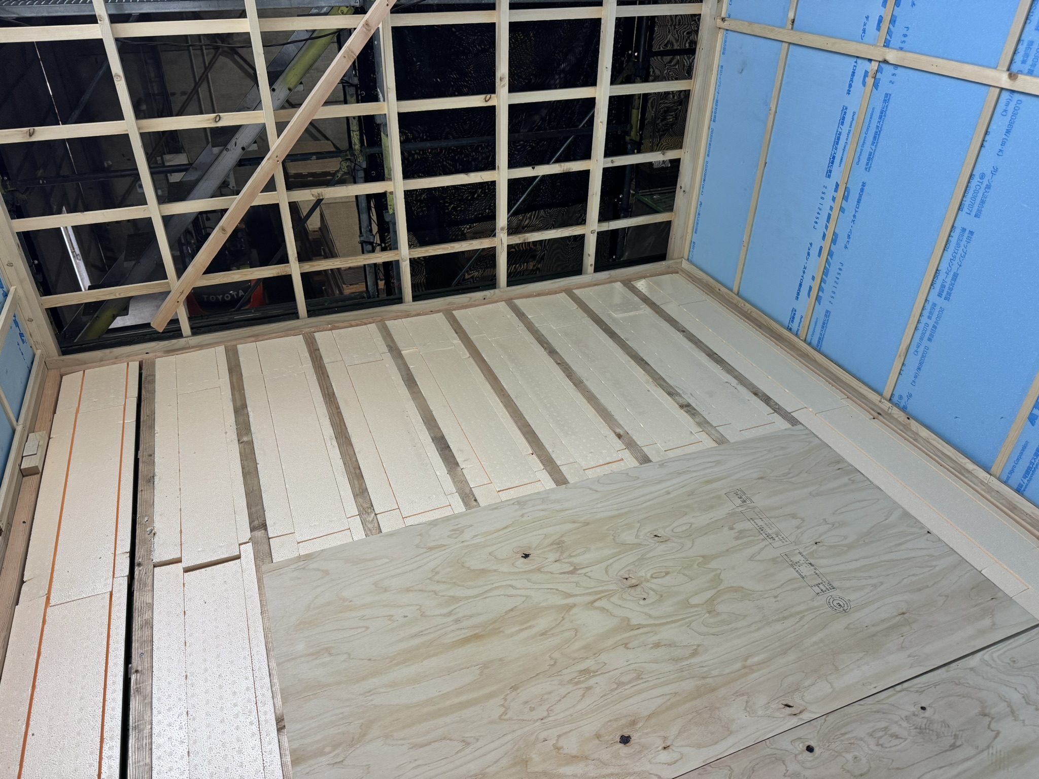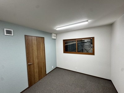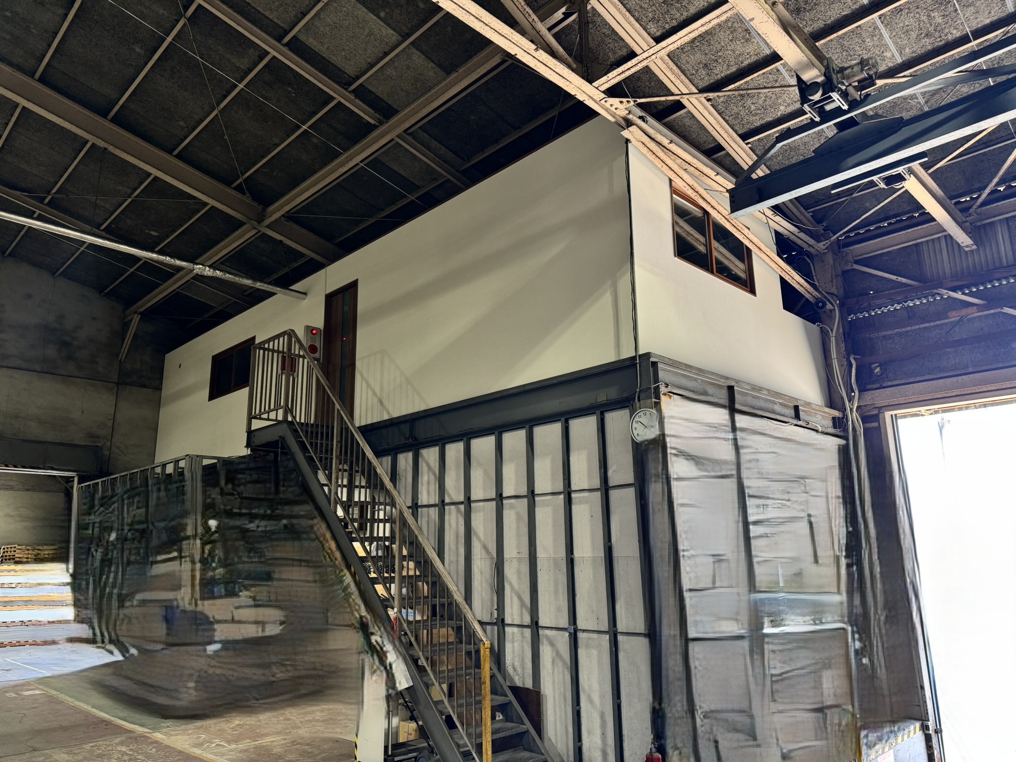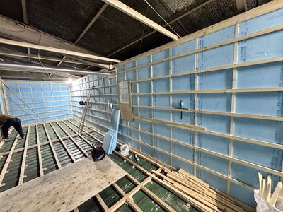 春日井市 某倉庫内2階新設工事 2025.06.24 倉庫内事務所上に、新しく2階会議室(休憩室)を新設させていただきました。もともと、資材置き場として利用していたため、スラブデッキが丸見えの状態でした。床不陸、天井高確保の兼ね合いから、工期を要してしまいますが木造にて、全て施工させていただきました。壁を起こしたのち、最大限天井高を確保できる形で施工させていただきました。屋根に近く、しっかりと冷暖房の高価を発揮するために6面全て断熱施工させていただきました。before during after