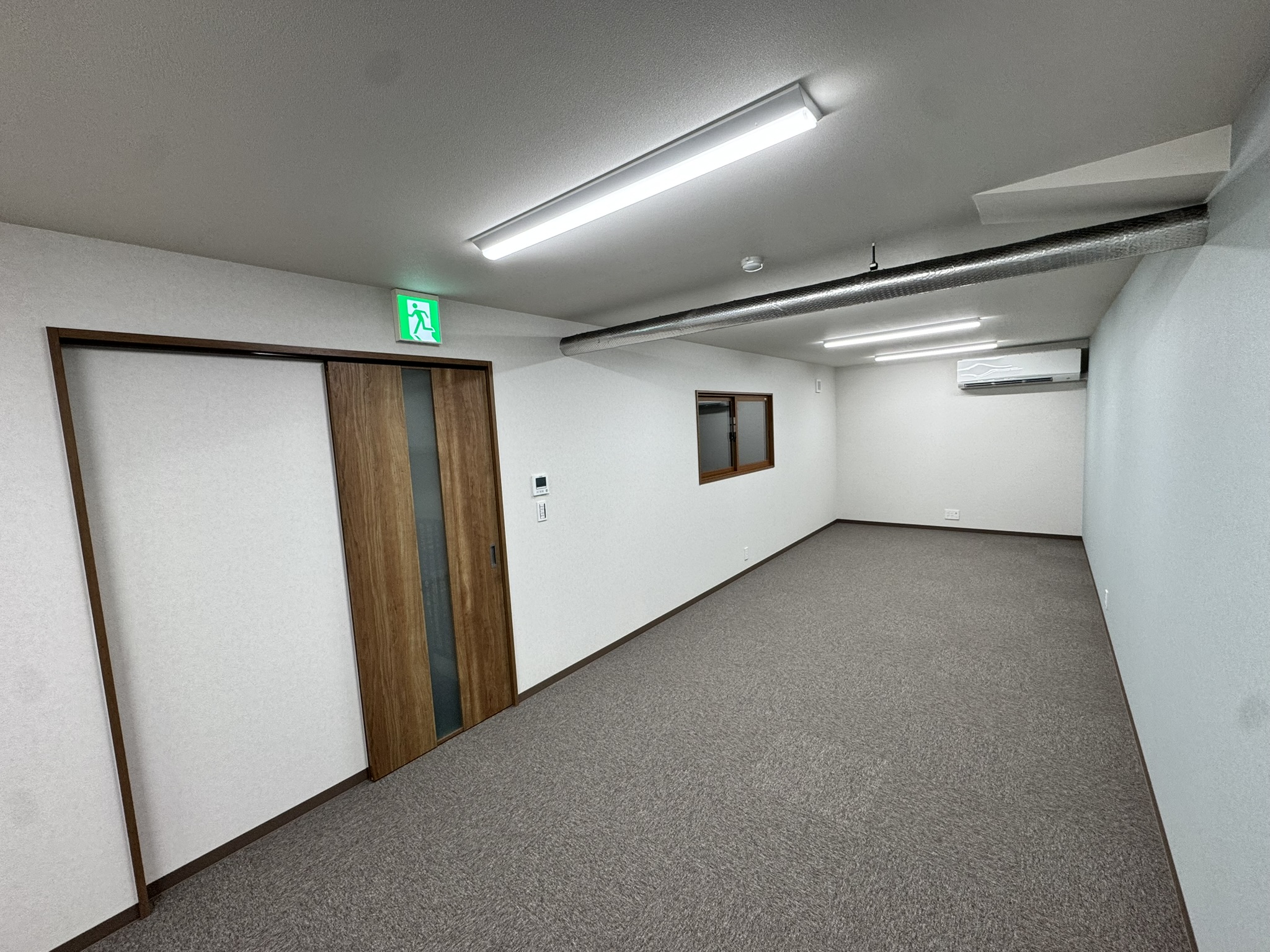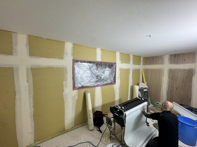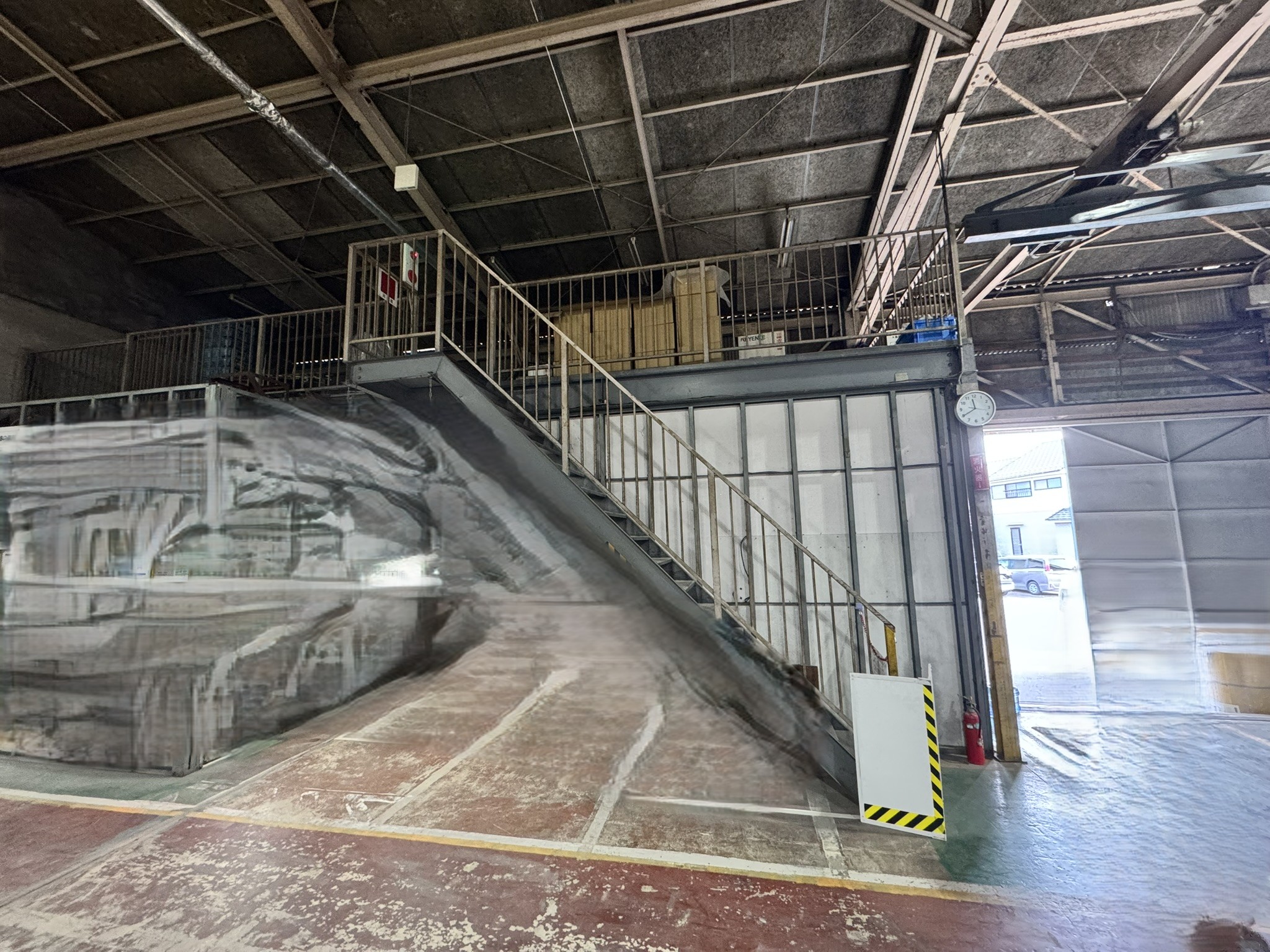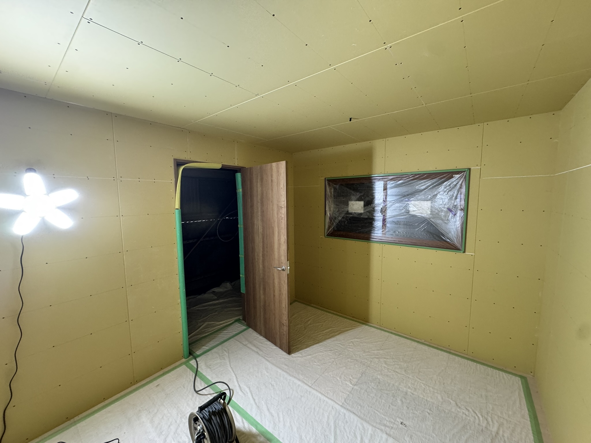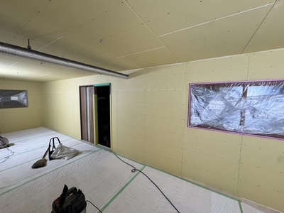 春日井市 某倉庫内2階新設工事 2025.06.24 倉庫内事務所上に、新しく2階会議室(休憩室)を新設させていただきました。もともと、資材置き場として利用していたため、スラブデッキが丸見えの状態でした。床不陸、天井高確保の兼ね合いから、工期を要してしまいますが木造にて、全て施工させていただきました。壁を起こしたのち、最大限天井高を確保できる形で施工させていただきました。屋根に近く、しっかりと冷暖房の高価を発揮するために6面全て断熱施工させていただきました。before during after